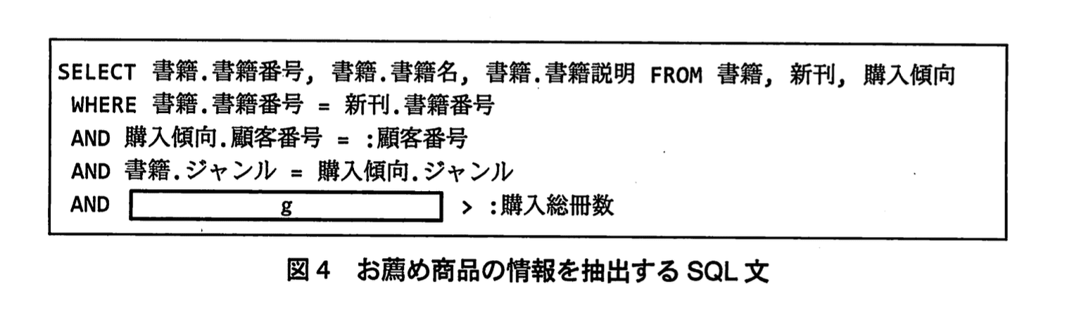 [手順3]を実現するために、お薦め商品の情報を抽出するSQL文を図4に示す。ここで、“:顧客番号”は指定された顧客番号を、“:購入総冊数”は指定された顧客が今日を含む過去180日以内に購入した総冊数を格納するホスト変数である。