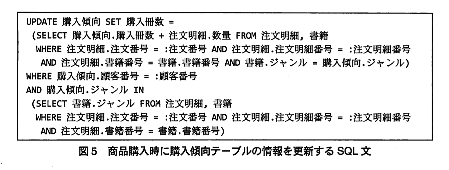 そこで、毎日バッチ処理で実行していた[手順2]の処理に加えて、顧客が商品を購入したタイミングで、その顧客に対する“購入傾向”にその時購入した商品の情報を追加することにした。その更新処理のための SQL 文を図5に示す。ここで、“:顧客番号”はその顧客の顧客番号を、“:注文番号”はその顧客の直前の注文に対応する注文番号を、“:注文明細番号”はその注文のうちの1つの注文明細に対応する注文明細番号を格納するホスト変数である。