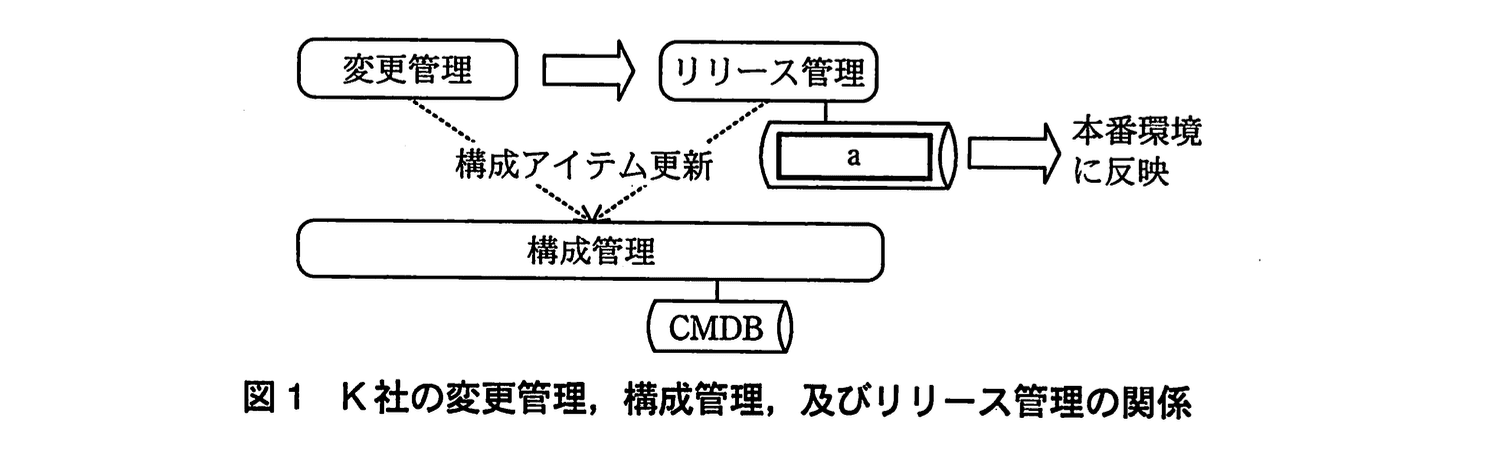 L君は、情報システム部のM課長にA案件の実施の承認を受け、変更のスケジュールを作成し、変更作業を着手した。ITサービスの構成情報を一元的に管理する構成管理データベース(CMDB)に対して、変更対象プログラムの変更作業登録を行うと、構成アイテム属性の一つであるステータスが“本番稼働中”から“開発中”に自動更新された。L君は、変更の構築・テストを完了し、リリース承認会議の場で正式リリース承認を受けた。その後、変更した確定版プログラムをaに格納し、本社内各部署及び全支店にリリース内容とリリース予定日をアナウンスした。リリース日に、①確定版プログラムが本番環境に反映された。K社の変更管理、構成管理、及びリリース管理の関係を、図1に示す。