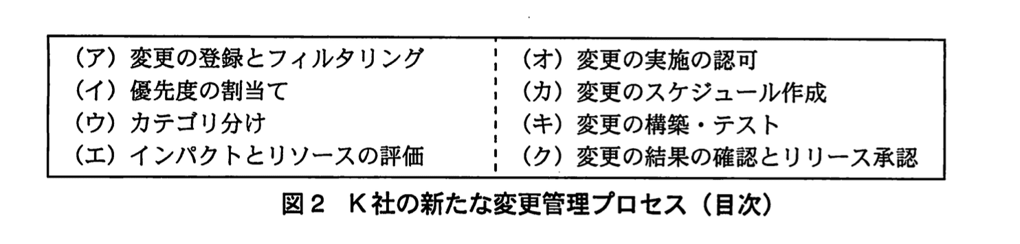 (2)K社の新たな変更管理プロセスの管理対象として適切なものを、解答群の中からすべて選び、記号で答えよ。