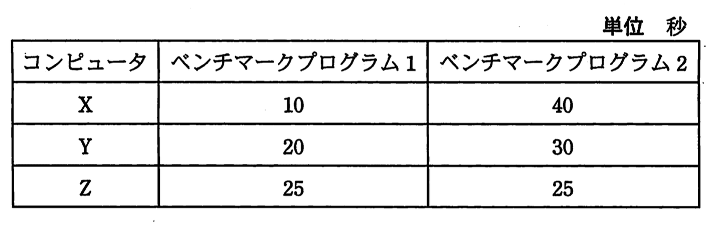 Yの性能をXより高いと誤認。処理時間の逆数の相乗平均でXが上。 - エ: Z, Y, X