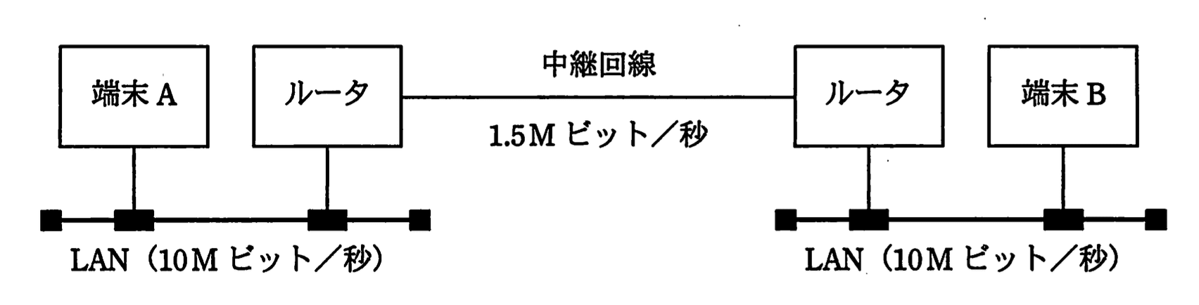 端末Aから端末Bまでの経路は「LAN(10Mbps)→ルータ処理(0.8ms)→中継回線(1.5Mbps)→ルータ処理(0.8ms)→LAN(10Mbps)」です。