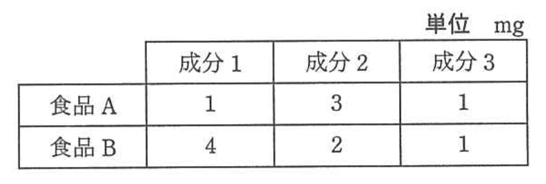- 根拠:食品Aと食品Bの成分含有量を用い、連立不等式を立てて最適解を求める線形計画問題として解きます。