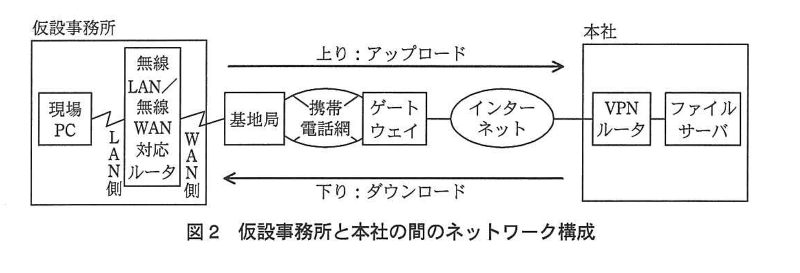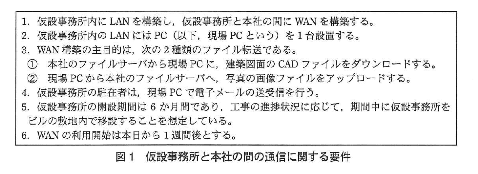 S社は建設会社である。ある日、情報システム部のT氏は、新規に建設するビルの工事現場に建てた仮設事務所と本社の間で通信を行うために、図1に示す要件を満たす方法を検討するよう指示を受けた。