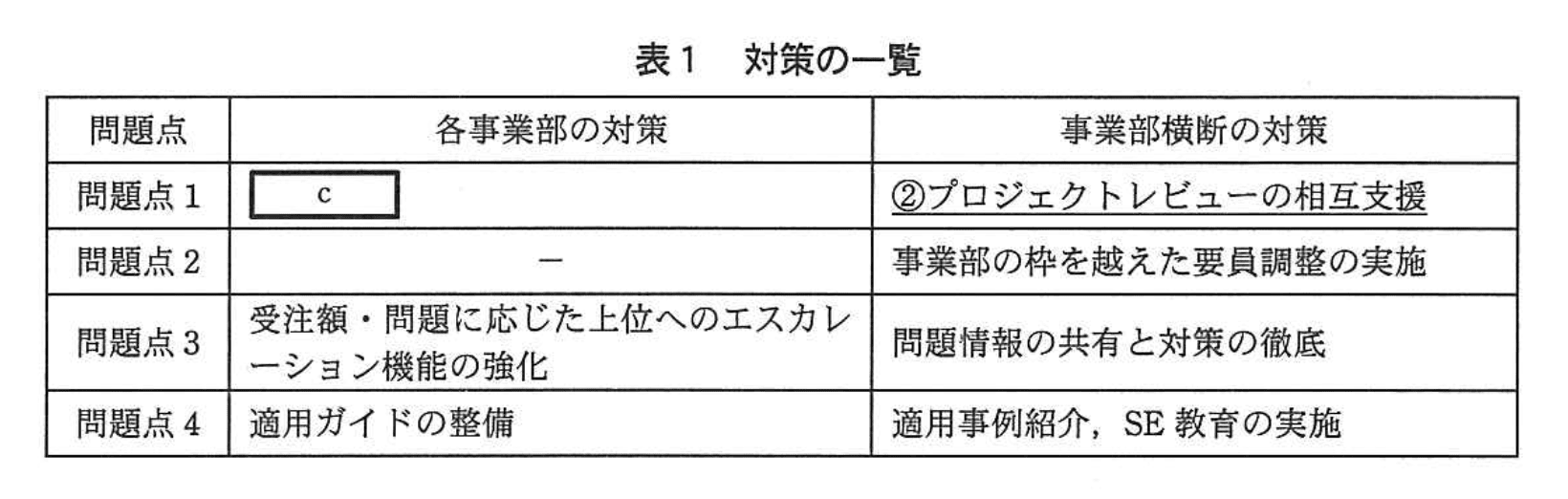 引用:「赤字の発生していないプロジェクトの多くでは、プロジェクトレビューの開催タイミング・頻度、メンバの選定、事前検討資料をSI案件に応じて強化していた。」 - 以上より、各事業部のPMが講じるべき手立ては「案件に応じてプロジェクトレビューの方法自体を強化すること」であると導けます。