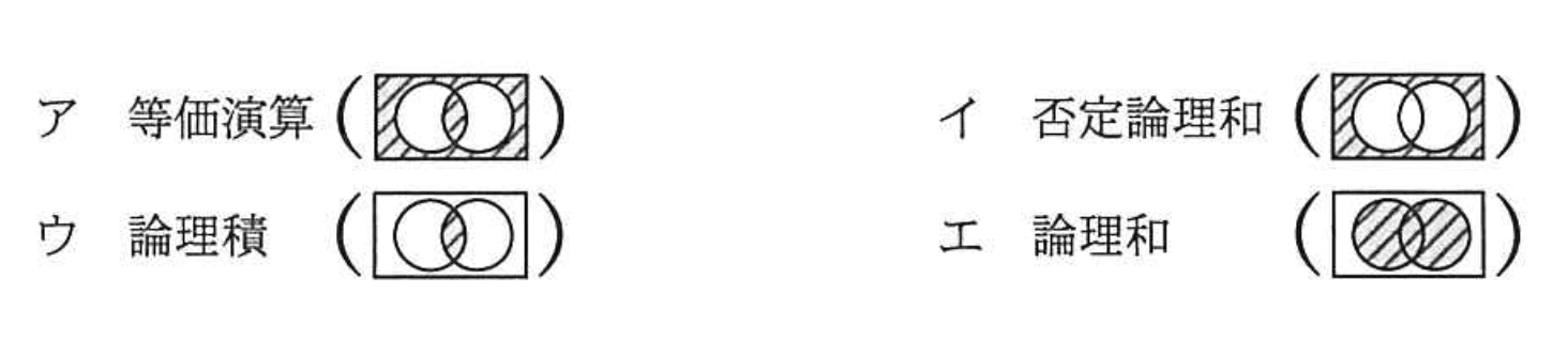 任意のオペランドに対するブール演算 Aの結果とブール演算 Bの結果が互いに否定の関係にあるとき、AはBの (又は、BはAの) 相補演算であるという。排他的論理和の相補演算はどれか。