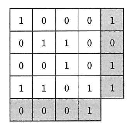- 各行にパリティビットを1つずつ付加し、5列目を作る。