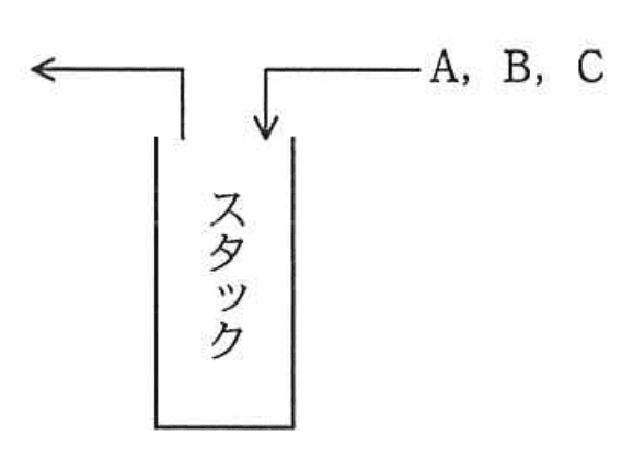 A,B,Cの順序で入力されるデータがある。各データについてスタックへの挿入と取出しを1回ずつ行うことができる場合、データの出力順序は何通りあるか。