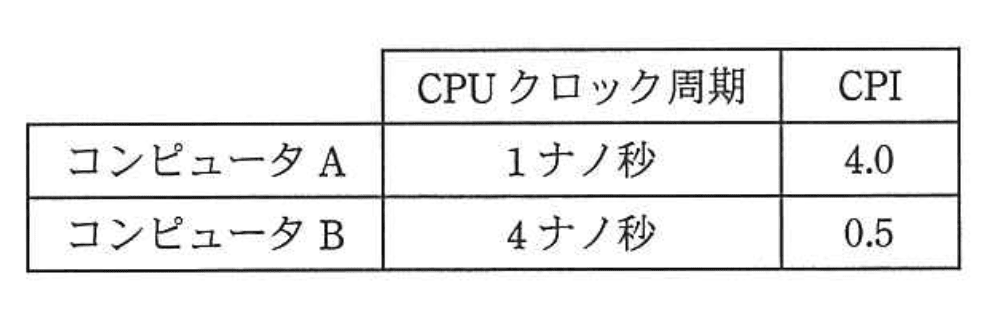 同じ命令セットをもつコンピュータ AとBがある。それぞれのCPUクロック周期、及びあるプログラムを実行したときの CPI (Cycles Per Instruction)は、表のとおりである。そのプログラムを実行したとき、コンピュータ Aの処理時間は、コンピュータBの処理時間の何倍になるか。