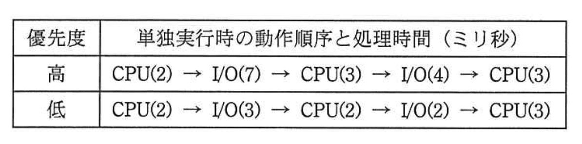 - 根拠:CPUは1個でI/Oも同時動作不可のため、優先度高のタスクを優先しつつI/O待ち時間を調整する必要がある。