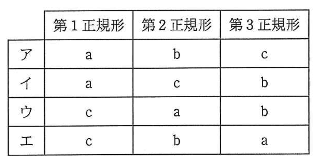 - ウ:正しい組合せであり、第1正規形=c、第2正規形=a、第3正規形=bが正解です。