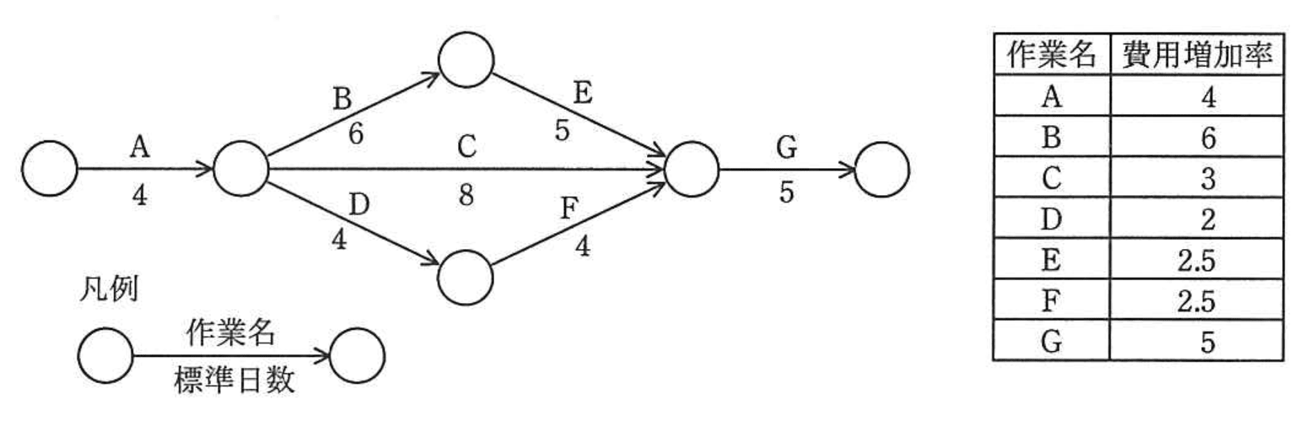 - 根拠:遅れを取り戻すにはクリティカルパス上の作業を短縮し、費用増加率が最も低い作業を選ぶことがコスト最小化の鍵です。
