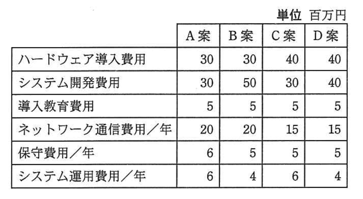 - 各案の初期費用(ハードウェア導入費用+システム開発費用+導入教育費用)を計算する。