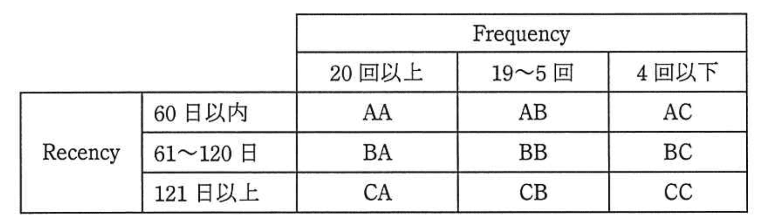 - 表の各セルの意味を把握し、RecencyとFrequencyの組み合わせを考える。