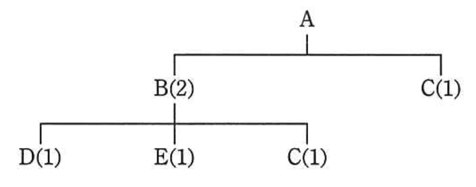 図は、製品 Aの構成部品を示している。この製品Aを 10 個生産する場合、部品 Cの手配数量は何個になるか。ここで、括弧内の数字は上位部品 1個当たりの所要数量であり、現在の部品Cの在庫は5個である。