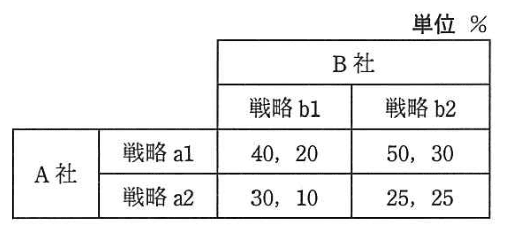 - 結論:ナッシュ均衡は「A社が戦略a1、B社が戦略b2を採る組合せ(イ)」です。