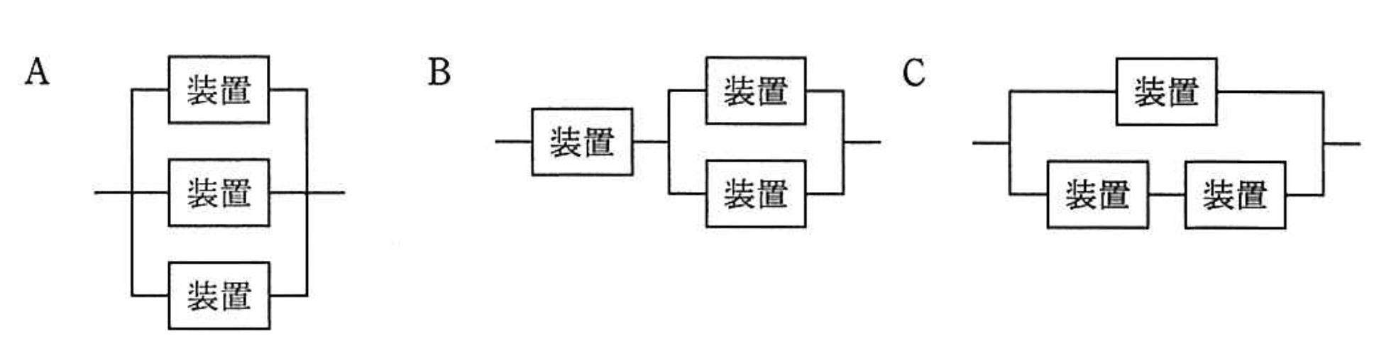 稼働率がの装置三つを用いて図のようにシステムを設計するとき、システムの稼働率が装置単体の稼働率を上回るものはどれか。ここで、並列に接続されている部分は、いずれかの経路が稼働していればシステムは稼働しているものとする。