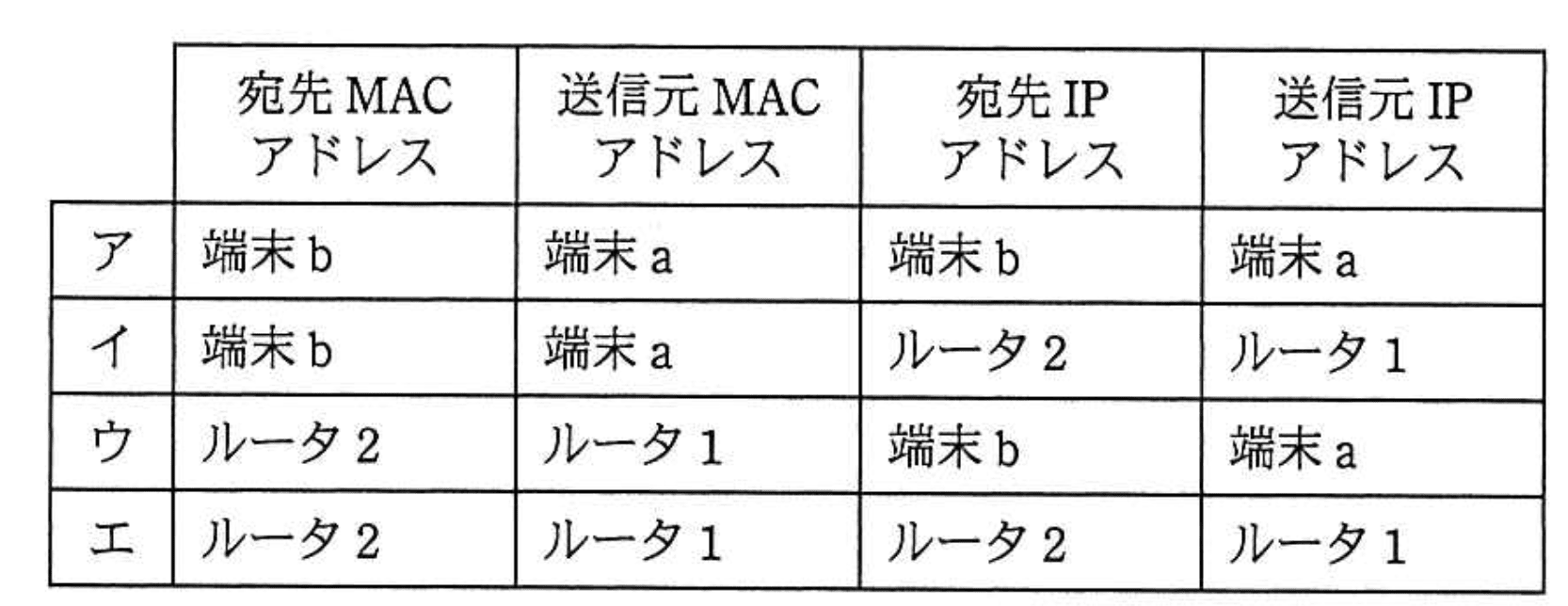 - ア:MACアドレスが端末間のものになっているが、ルータ間の物理通信ではMACアドレスはルータのものに変わるため誤り。