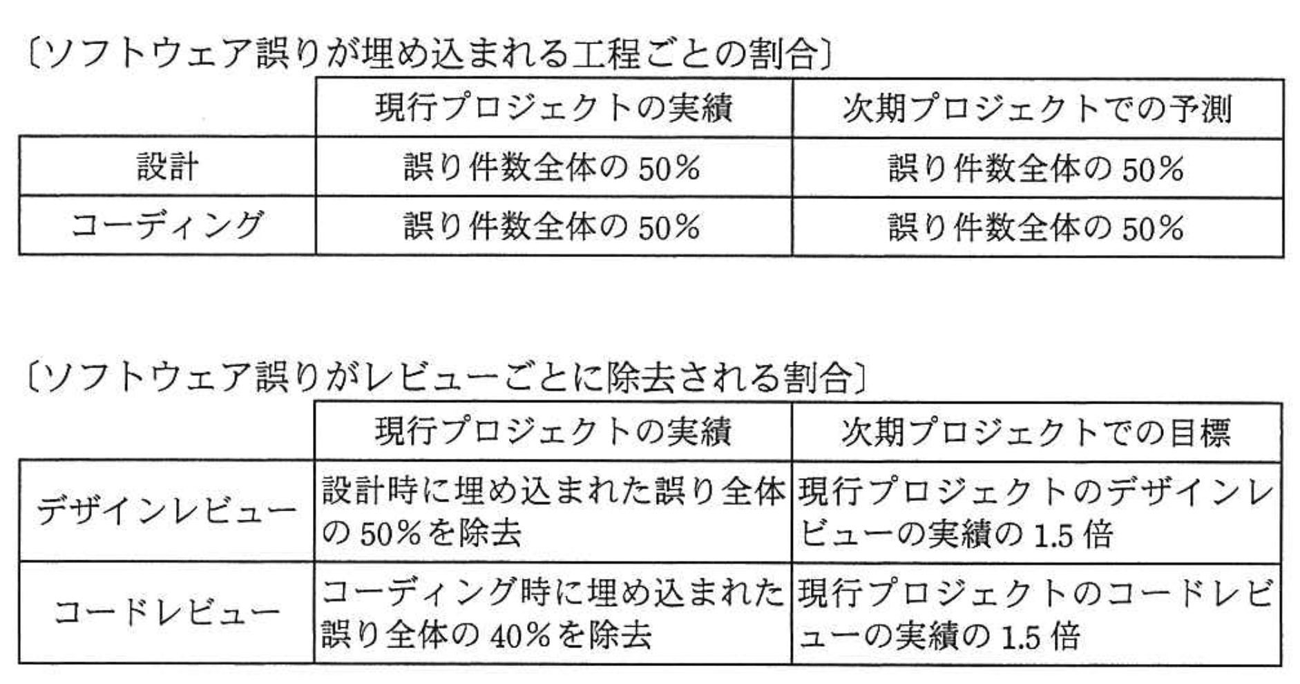 - 根拠:設計・コーディングで埋め込まれた誤りの割合とレビューでの除去率を基に、次期プロジェクトの目標値(1.5倍)を反映して計算する。