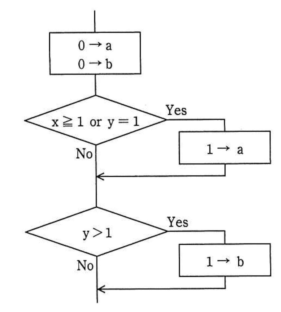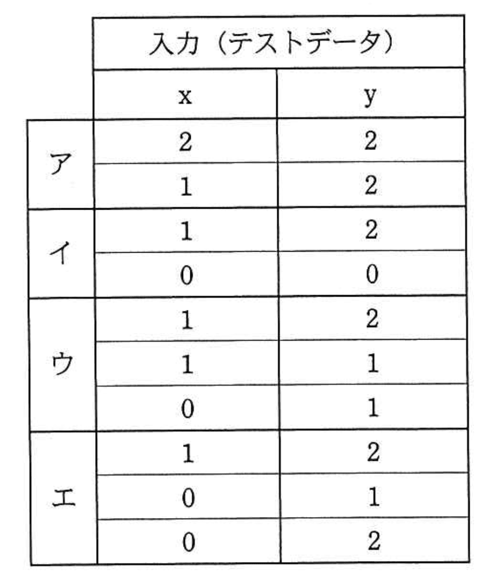 - ウ:条件「y > 1」の偽をカバーしているが、「x ≥ 1 or y = 1」の偽を十分に網羅できていない。