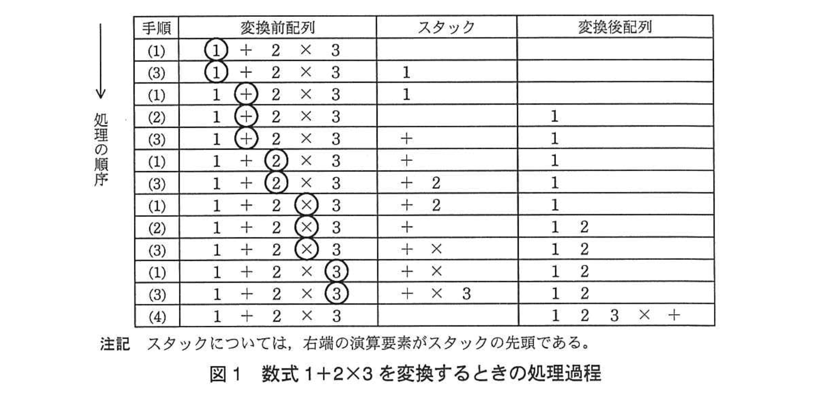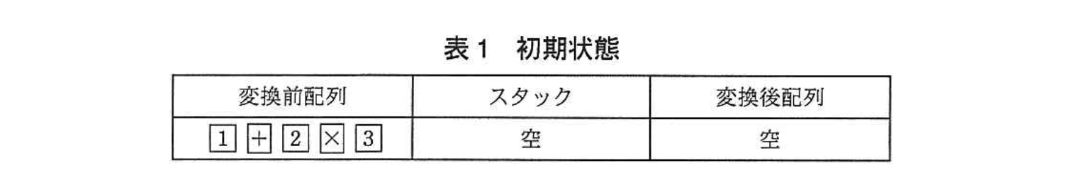 演算要素の優先度を表2に、数式 1+2×3 を変換するときの処理過程を図1に示す。なお、図1中の丸で囲った演算要素は、(1)の手順で参照した演算要素である。