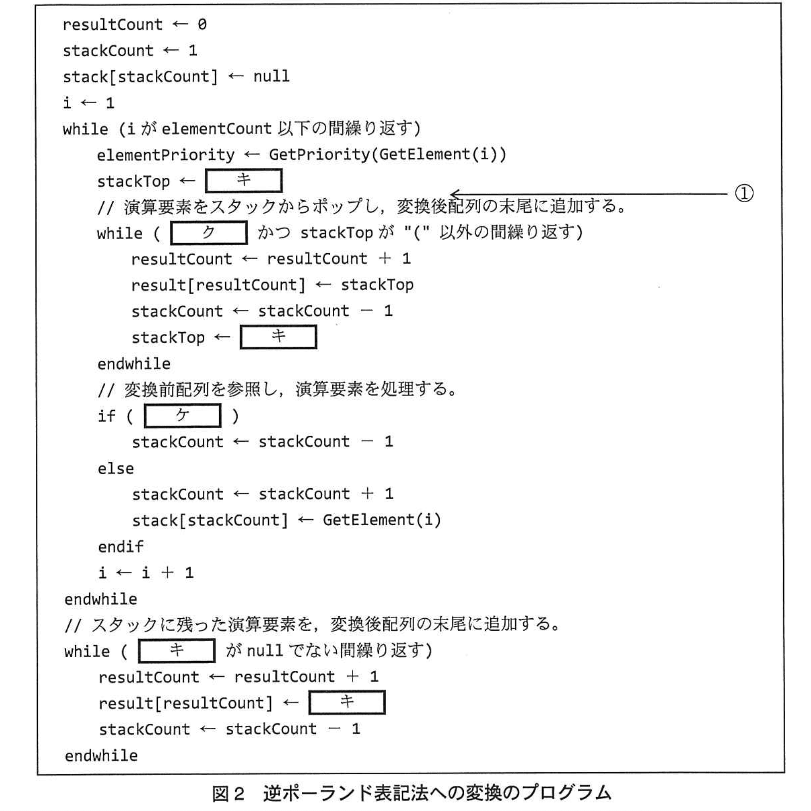null がスタックからポップされることがないようにするために、その優先度を オ と定義する。こうすることで、プログラム中、手順②の処理を行う部分で カ の判定処理を記述する必要がなくなり…」 - 手順②は【逆ポーランド表記法への変換アルゴリズム】で