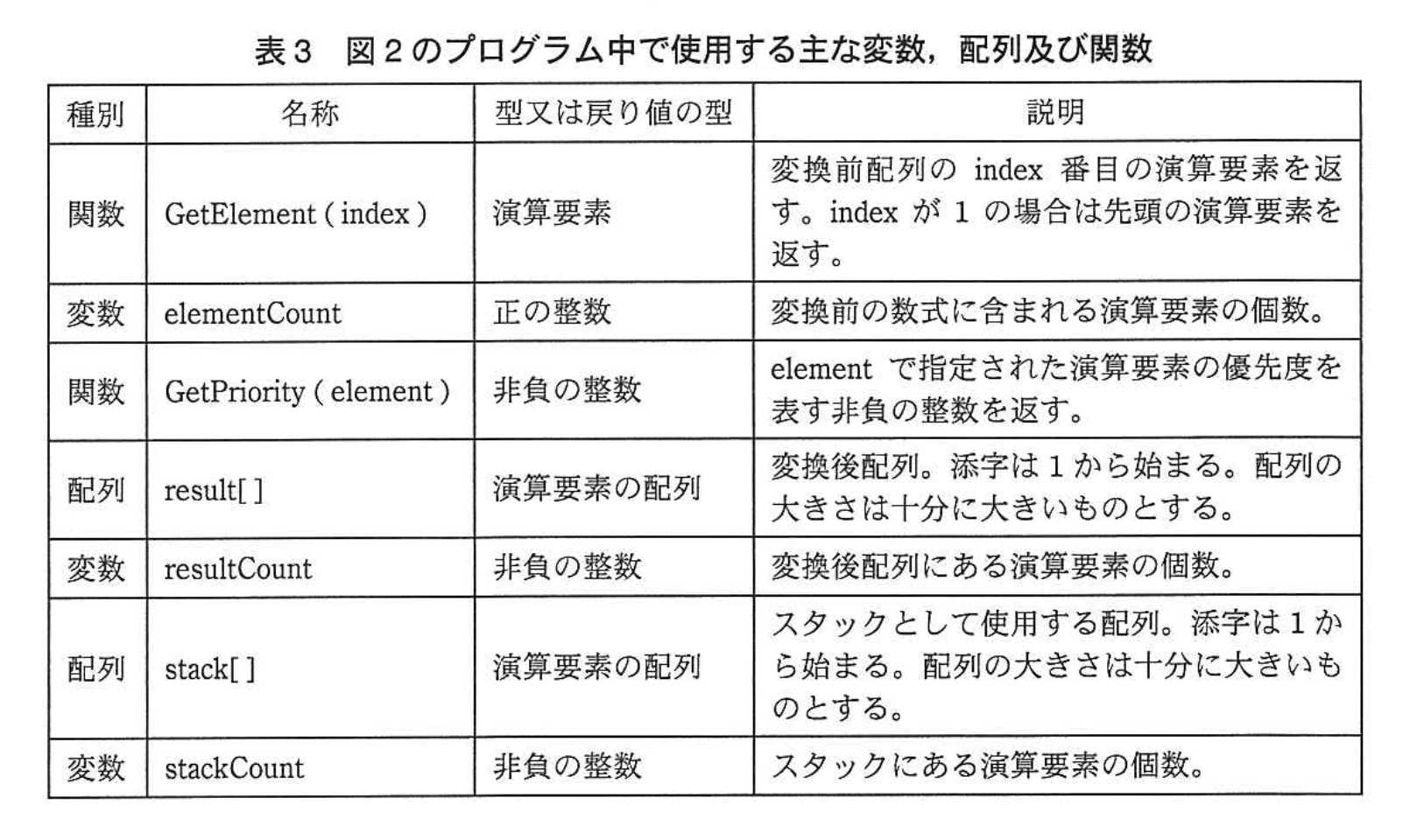 逆ポーランド表記法への変換プログラムを作成した。プログラム中で使用する主な変数、配列及び関数を表3に、作成したプログラムを図2に示す。