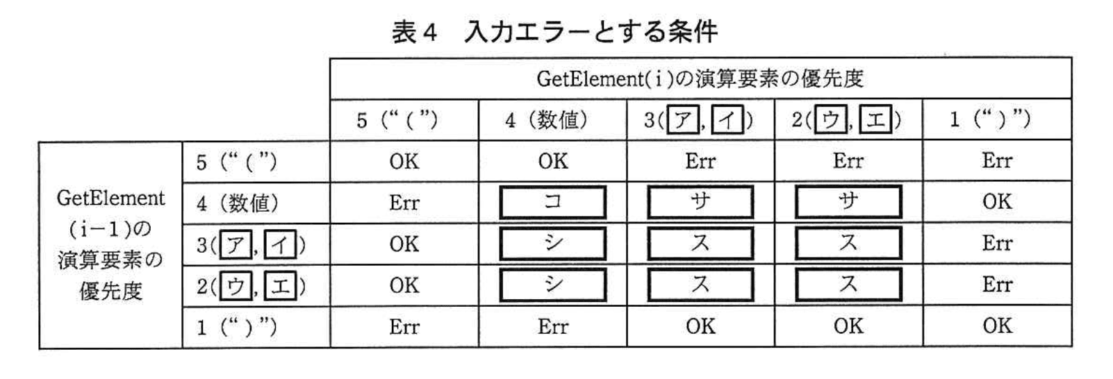入力エラーとする条件を表4に示す。GetElement(i−1) の優先度を、GetElement(i)の優先度について、表4に従って評価をした結果、“OK”の場合は、そのまま処理を続行する。評価した結果が“Err”の場合は、入力された数式が誤っていると判断して処理を中断する。