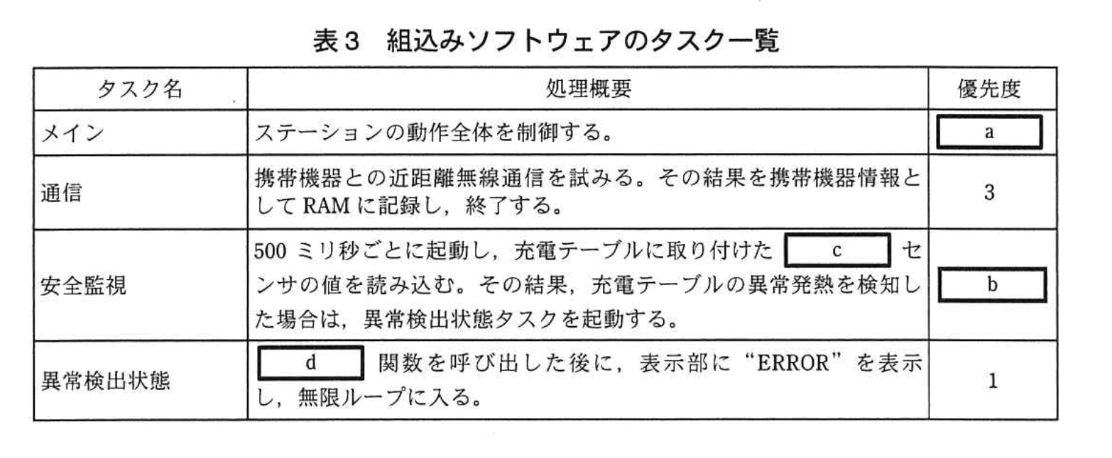“通信”タスク(優先度3)より高く、“異常検出状態”タスク(優先度1)よりは低い順位が最適です。よって 2 が割り当てられます。 -