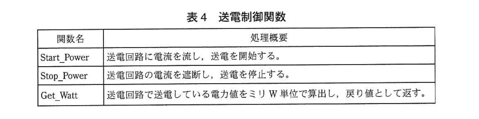組込みソフトウェアで使用する送電制御関数を、表4に示す。