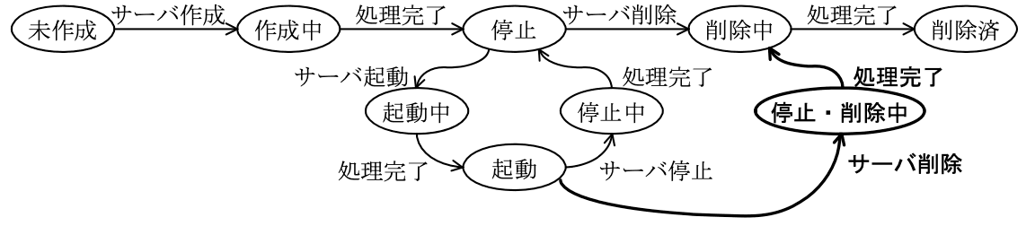 - “停止” 状態で “サーバ削除” メッセージを受信した場合、図2では “停止” → “削除中” へ遷移します。