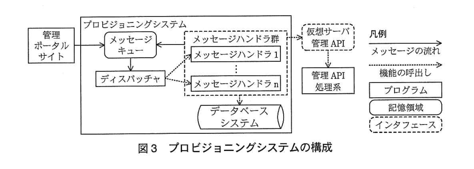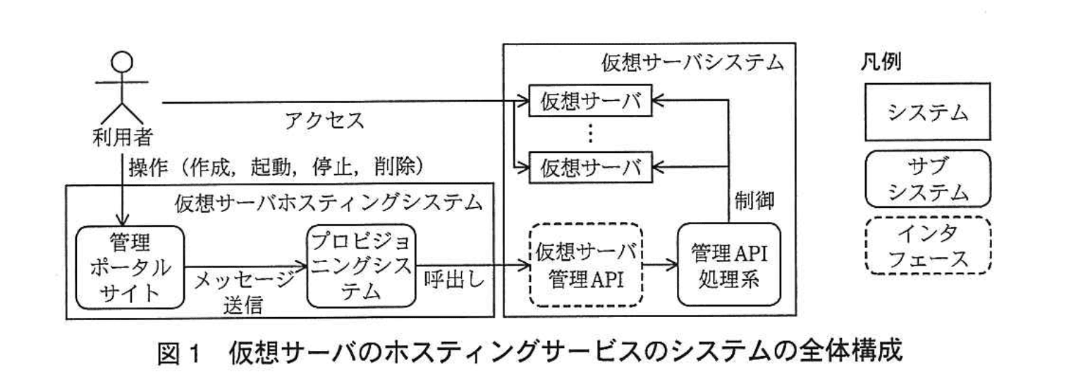 プロビジョニングシステムは、管理ポータルサイトからのメッセージに応じて仮想サーバ管理 API を呼び出すことで、仮想サーバの作成、起動、停止及び削除を行うシステムである。