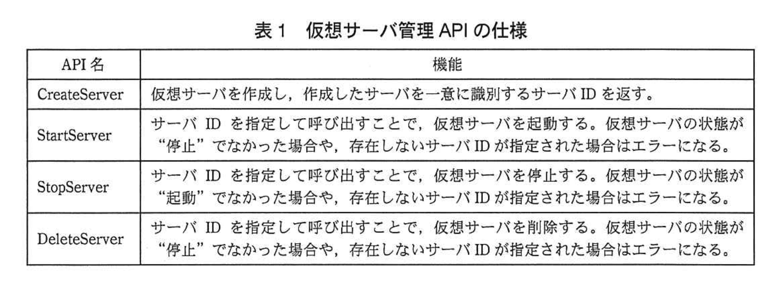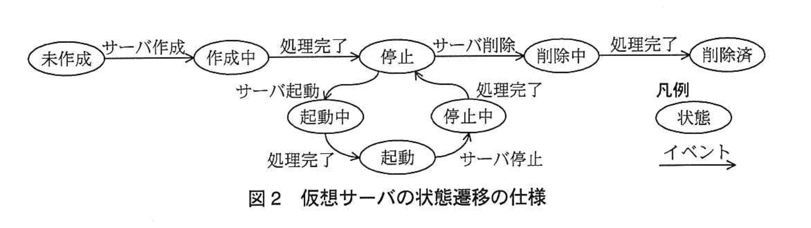 仮想サーバ管理 API の仕様上、仮想サーバには、未作成中、作成中、起動中、起動停止中、停止、削除中及び削除済の状態がある。仮想サーバ管理 API の仕様を表1に示す。