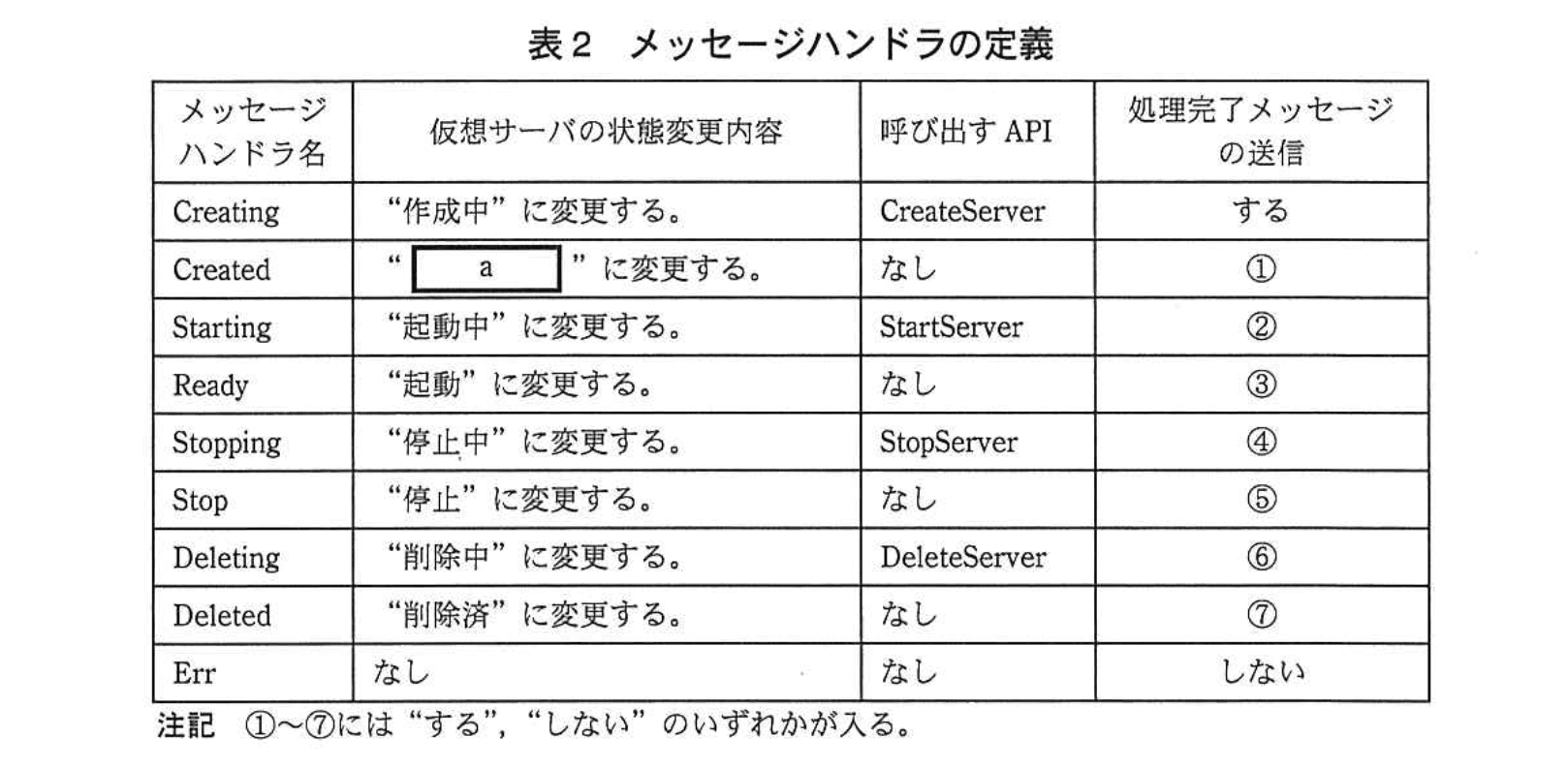 へ修正します。設問(3)の空欄は従って d=起動, e=サーバ削除, f=StopDeleting です。 - 表2・表3の他のセルは従来仕様と衝突しないため変更不要です。なお (1) の空欄 a は CreateServer 処理完了後の安定状態なので “停止”、(2) の b は “停止” から起動要求を受けた際のハンドラで “Starting”、(2) の c は “停止” から削除要求を受けた際のハンドラで “Deleting” となります。