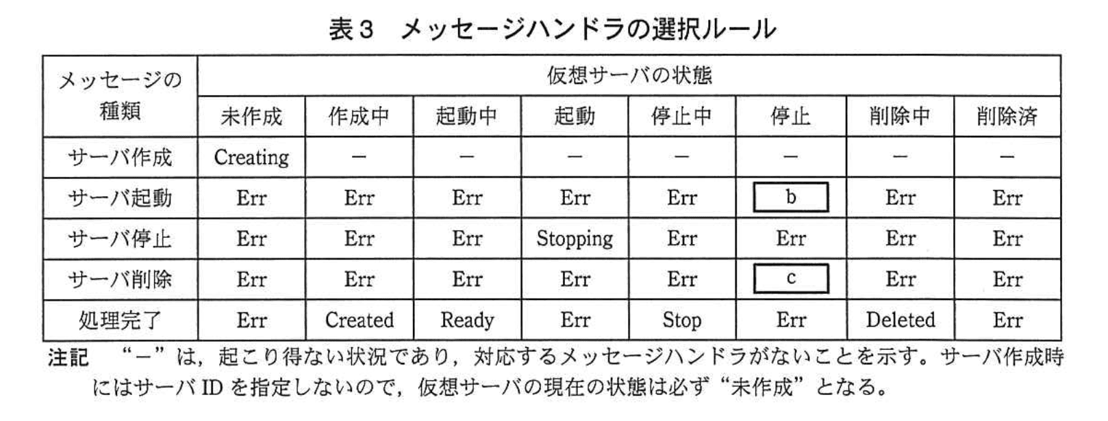 - 表3の行・列を点検すると、(i) 以前は “起動 × サーバ削除” のセルに Err が入っており、削除要求をエラーにしていました。今回の仕様変更はまさにこの箇所を置き換えるものなので、