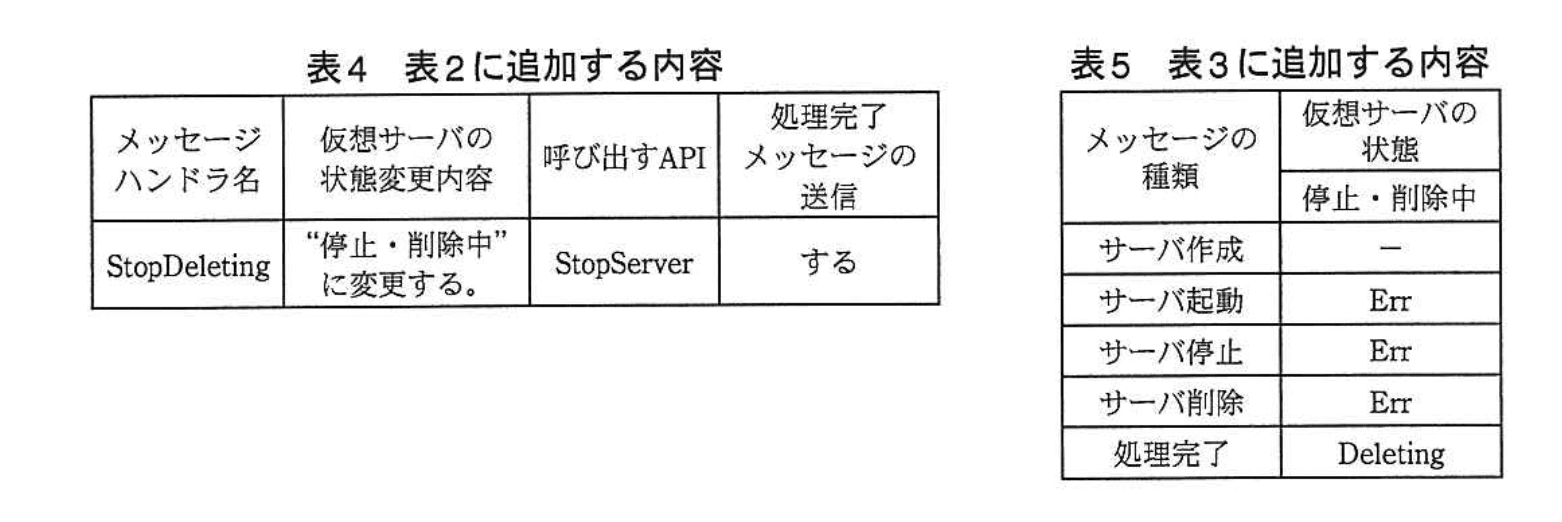 仮想サーバの状態が“起動”のときに、サーバ削除のメッセージを受信した場合は、メッセージハンドラが StopServer の API を呼び出した後、自動的に状態遷移して、続いて DeleteServer の API が呼び出されるようにすることで、サーバを削除できるように仕様を変更することにした。このとき、(i)サーバ停止とサーバ削除の二つのメッセージをメッセージキューに格納するだけだと、意図した結果にならないことがある。そこで、“停止・削除中”の状態を新設することにした。