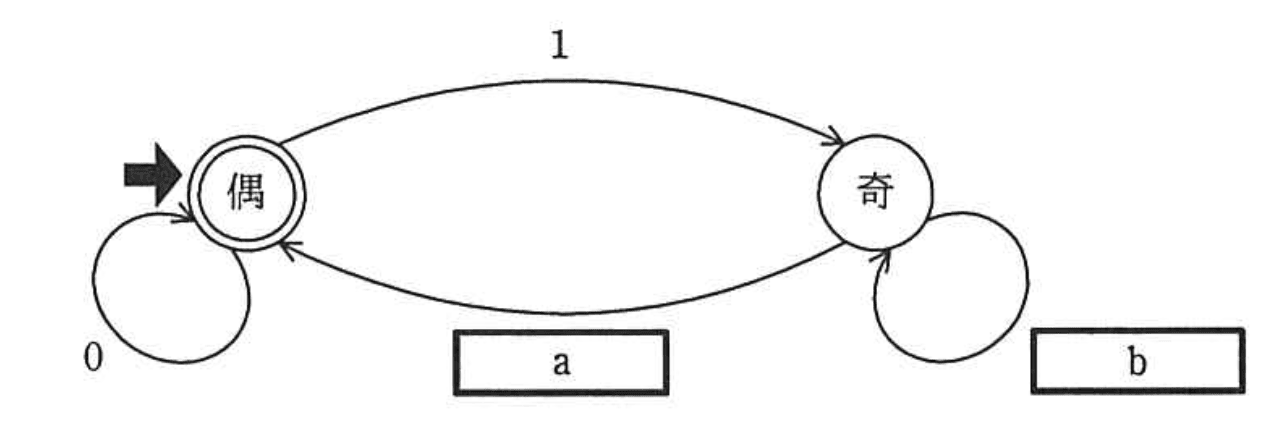状態「偶」は偶数個の1を含むビット列を受理し、自己ループの入力が0であるため、0を読み込んでも状態は変わりません。一方、「偶」から「奇」へ遷移するのは1の入力です。