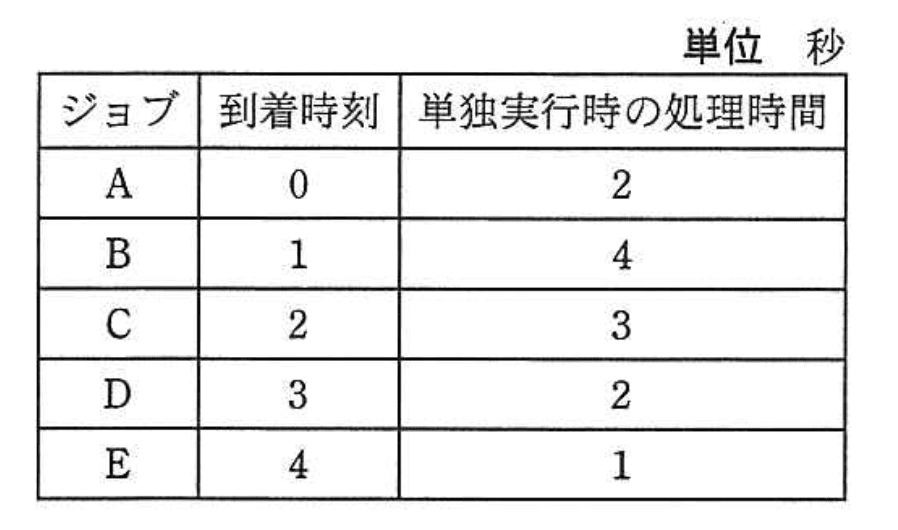 - 2秒以降は処理時間が最短のE(1秒)から順に処理され、Bは最後に実行されるため、Bの終了時刻は12秒、到着時刻1秒からの差は11秒となります。