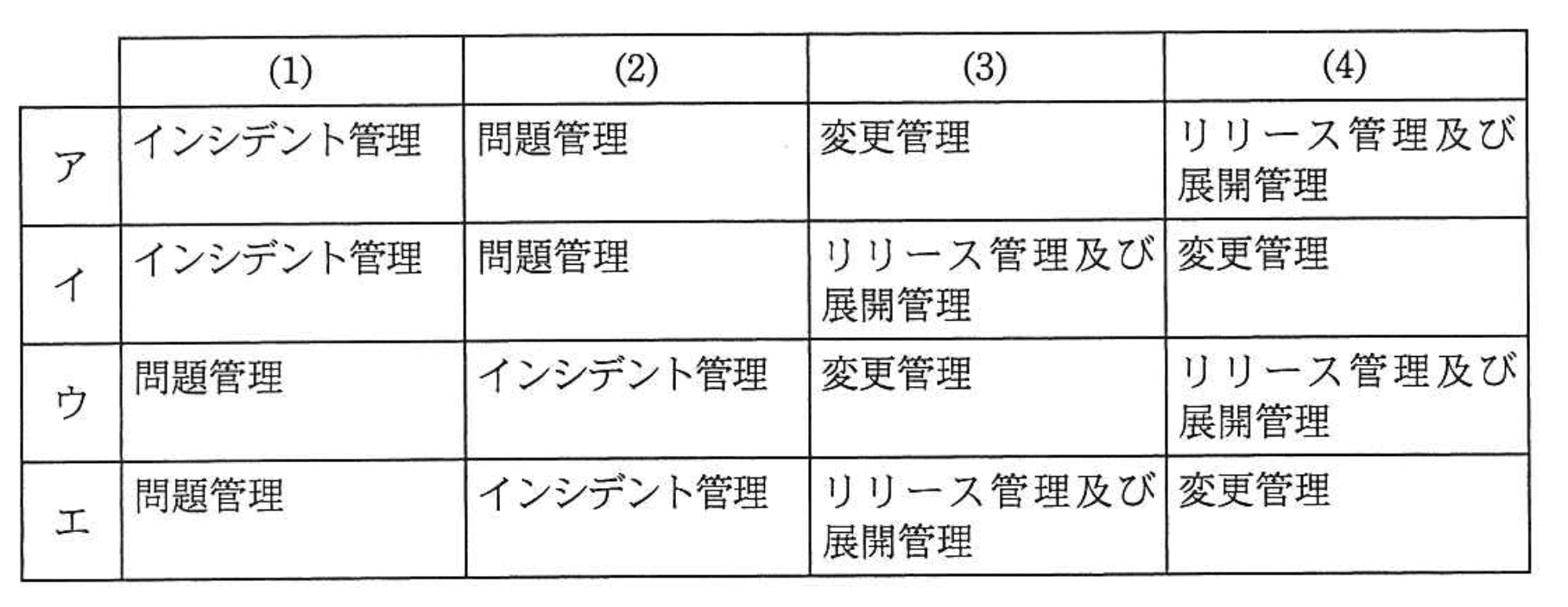 - エ:ウと同様にインシデント管理と問題管理の役割が逆転し、さらに変更管理とリリース管理も逆になっている。