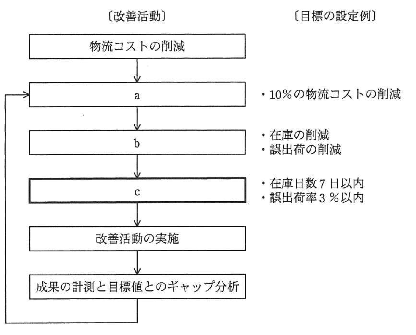 物流業務において,10%の物流コストの削減の目標を立てて、図のような業務プロセスの改善活動を実施している。図中のcに相当する活動はどれか。