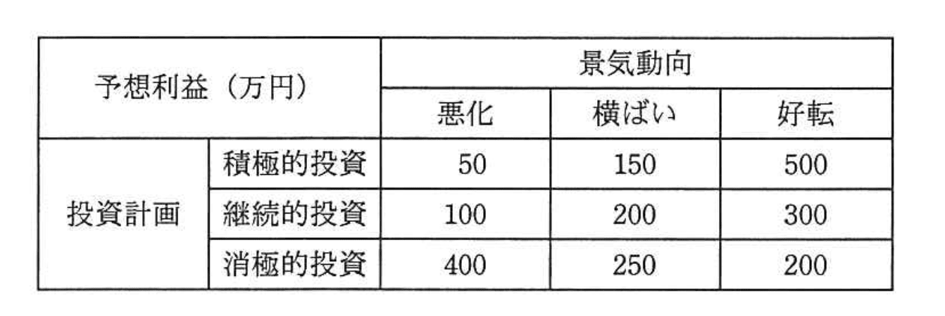 経営会議で来期の景気動向を議論したところ、景気は悪化する、横ばいである、好転するという三つの意見に完全に分かれてしまった。来期の投資計画について、積極的投資、継続的投資、消極的投資のいずれかに決定しなければならない。表の予想利益については意見が一致した。意思決定に関する記述のうち、適切なものはどれか。