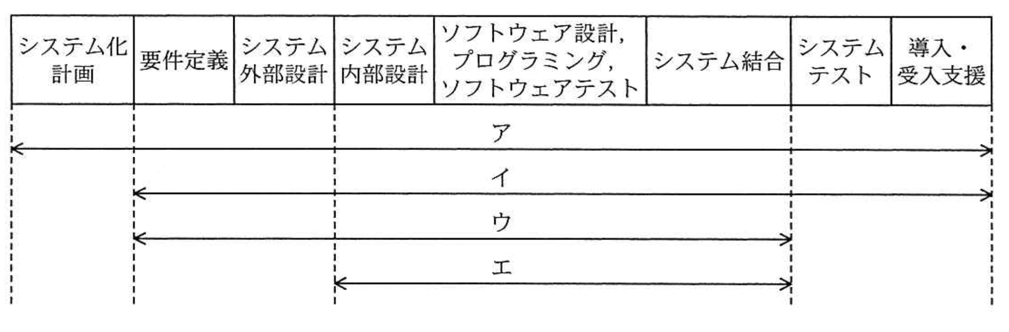 - 「システム内部設計」から「システム結合」までの範囲が該当する「エ」を選ぶ。
