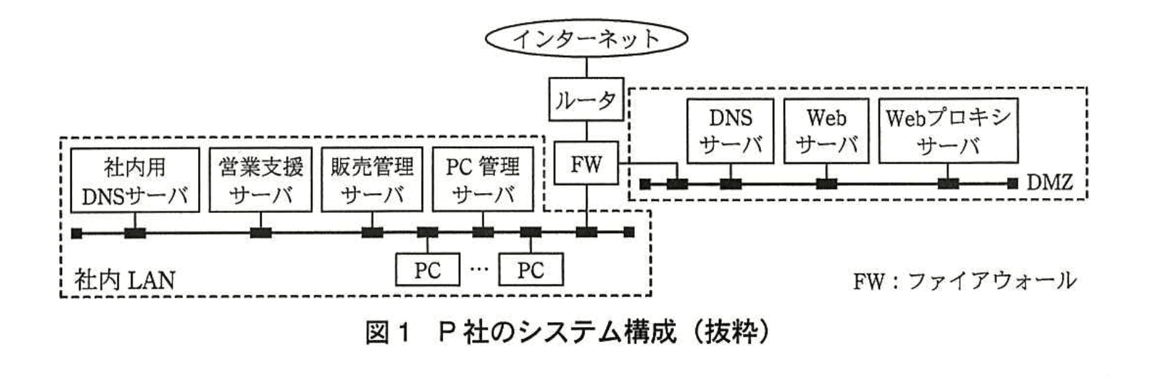 P社は、コンピュータ関連製品の販売会社である。P社では、営業支援システムと販売管理システムを運用している。営業支援システムでは、製品資料、顧客情報、プレゼンテーション資料などが参照できる。営業支援システムは、販売管理システムと連携しており、在庫数の確認や在庫の引当てもできる。各システムは、それぞれのサーバで稼働している。