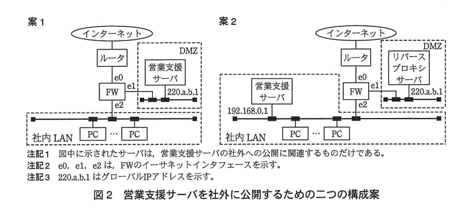 案1は、営業支援サーバに SSL を導入して、DMZ に移設するものであり、案2は、SSL を導入したリバースプロキシサーバを、新規に DMZ に設置するものである。