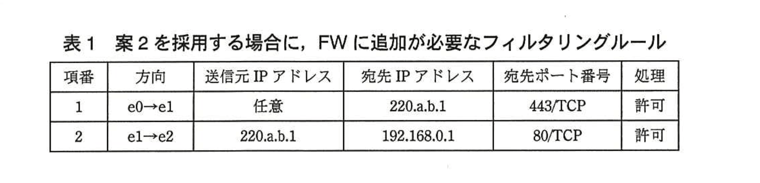 案2を採用すると、FW で新たに通信を許可しなければならない通信が発生する。P社が導入している FW は、ステートフルインスペクション機能をもつので、FW が最初に受信して通過させるパケットの内容の設定だけで済む。案2を採用する場合に、FW に追加が必要なフィルタリングルールを表1に示す。