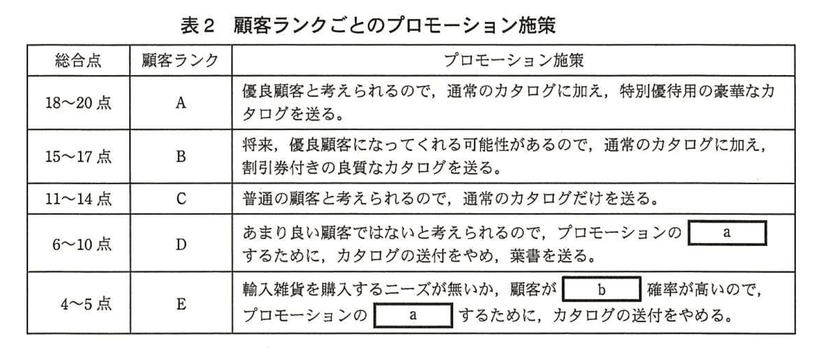 高ランク(A・B)にはカタログや割引券など費用を掛け、低ランク(D・E)には葉書や送付取り止めで費用を抑えています。- 【問題文】表2「D…カタログの送付をやめ、葉書を送る」「E…カタログの送付をやめる」