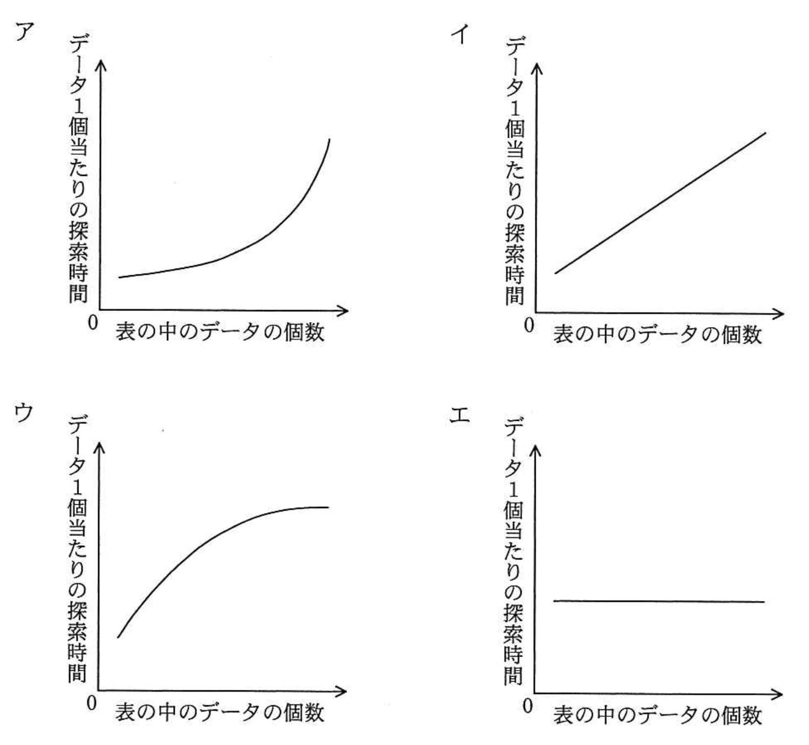 - イ:探索時間がデータ数に比例して増加する直線は、線形探索や配列の線形検索に近い。