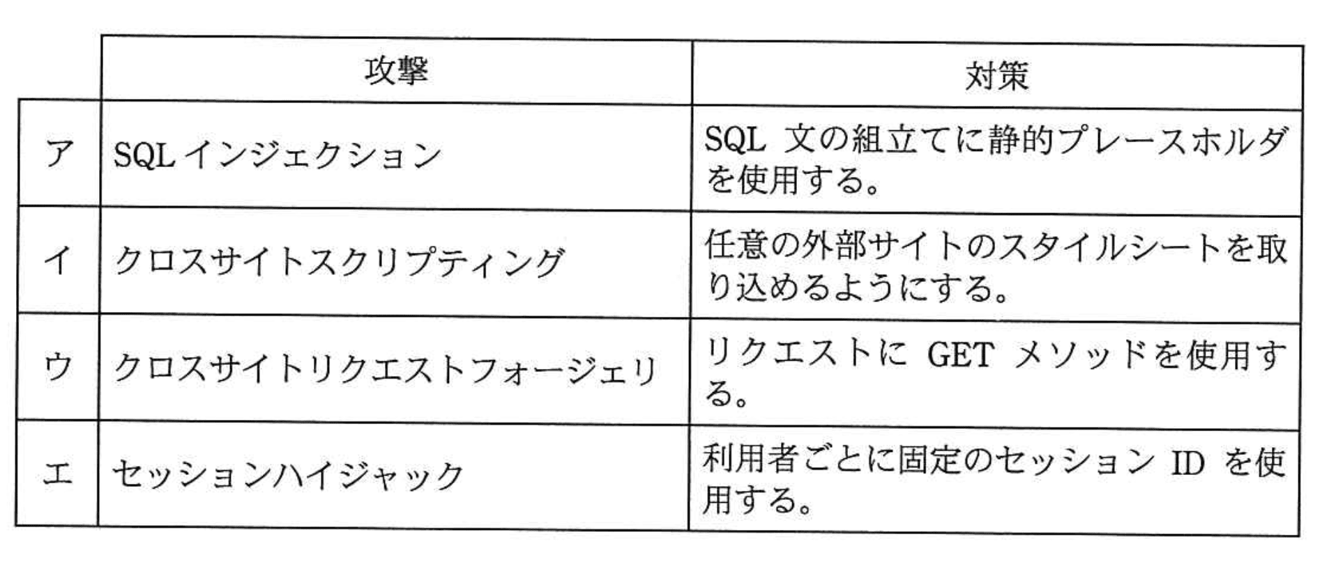 - ウ:クロスサイトリクエストフォージェリ対策に「GETメソッドを使用する」は誤りです。CSRF対策にはトークンの利用やPOSTメソッドの活用が推奨されます。