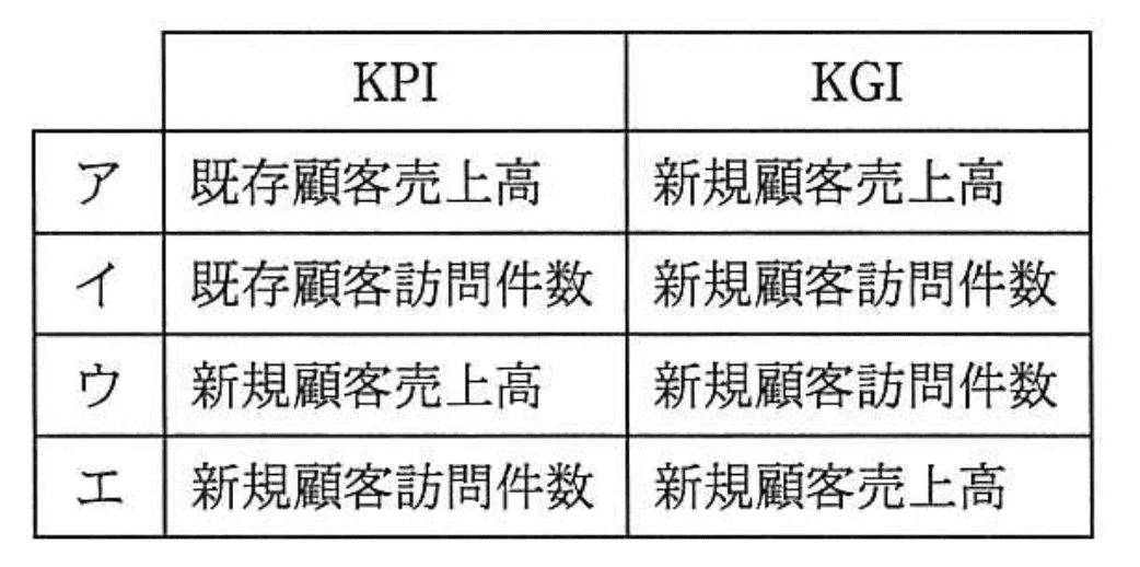 - イ:「既存顧客訪問件数」をKPI、「新規顧客訪問件数」をKGIとしていますが、訪問件数はプロセス指標であり、KGIには成果指標が必要です。