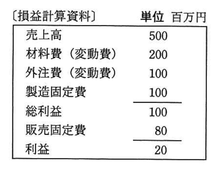 変動費は材料費200百万円+外注費100百万円=300百万円、売上高500百万円に対する変動費率は300/500=0.6。